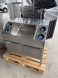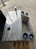 Juoma-asema vesihanalla, jääkaukalolla ja mukipidikkeillä. Juoma-aseman kannessa muutamia reikiä, kuvissa näkyy.